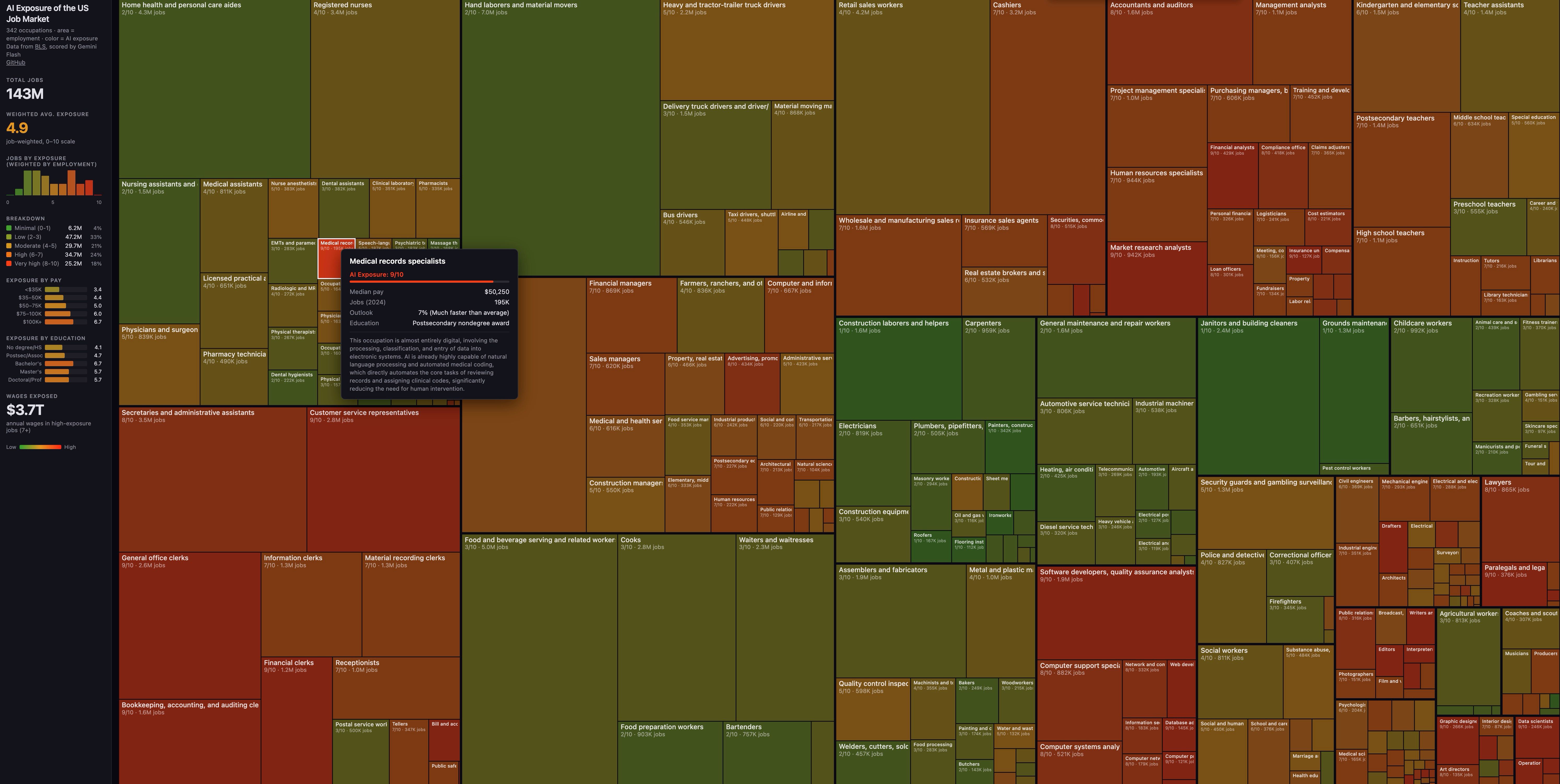 A researcher named Josh Kale recently published an interactive visualization of AI exposure across 342 U.S. occupations, built using Bureau of Labor Statistics occupational task data. The results are worth sitting with.